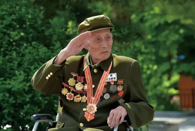 阳光透过窗户照进来,病房床头的墙上挂着两幅照片:身着老式军装的孙景坤,身上挂满了奖章、纪念章,在庄重地行军礼。