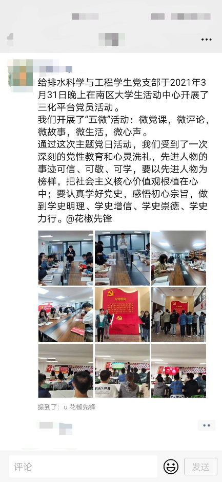 2021年4月2日,土建学院给排水科学与工程学生党支部在支部副书记倪主业同志的带领下,在南区学生一站式服务中心开展了以“学党史以铭志,守初心以志远”为主题的党日活动,以实际行动向建党一百周年献礼。活动以“五微”的形式进行,分别为关于党史的微党课、对于时事讨论的微评论、围绕优秀党员的微故事、重温入党誓词的微生活以及活动分享的微心声。活动期间,大家积极参与、踊跃发言。借此学习机会重温党史,肩负起历史使命,增强党员意识,深刻党员思想!