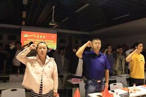 党员入场就座期间,屏幕上播放各党支部党员我与国旗的合影,写给祖国的三行情书,歌声礼赞、告白祖国的视频剪辑,晚会现场布置一新,印有70周年字样的红气球、党员手中挥舞的国旗、脸上的国旗贴、一张张有象征意义的红色PPT、矿泉水瓶上的国旗贴,党员胸前的党员徽章都彰显了为党和祖国歌颂的鲜明主题。