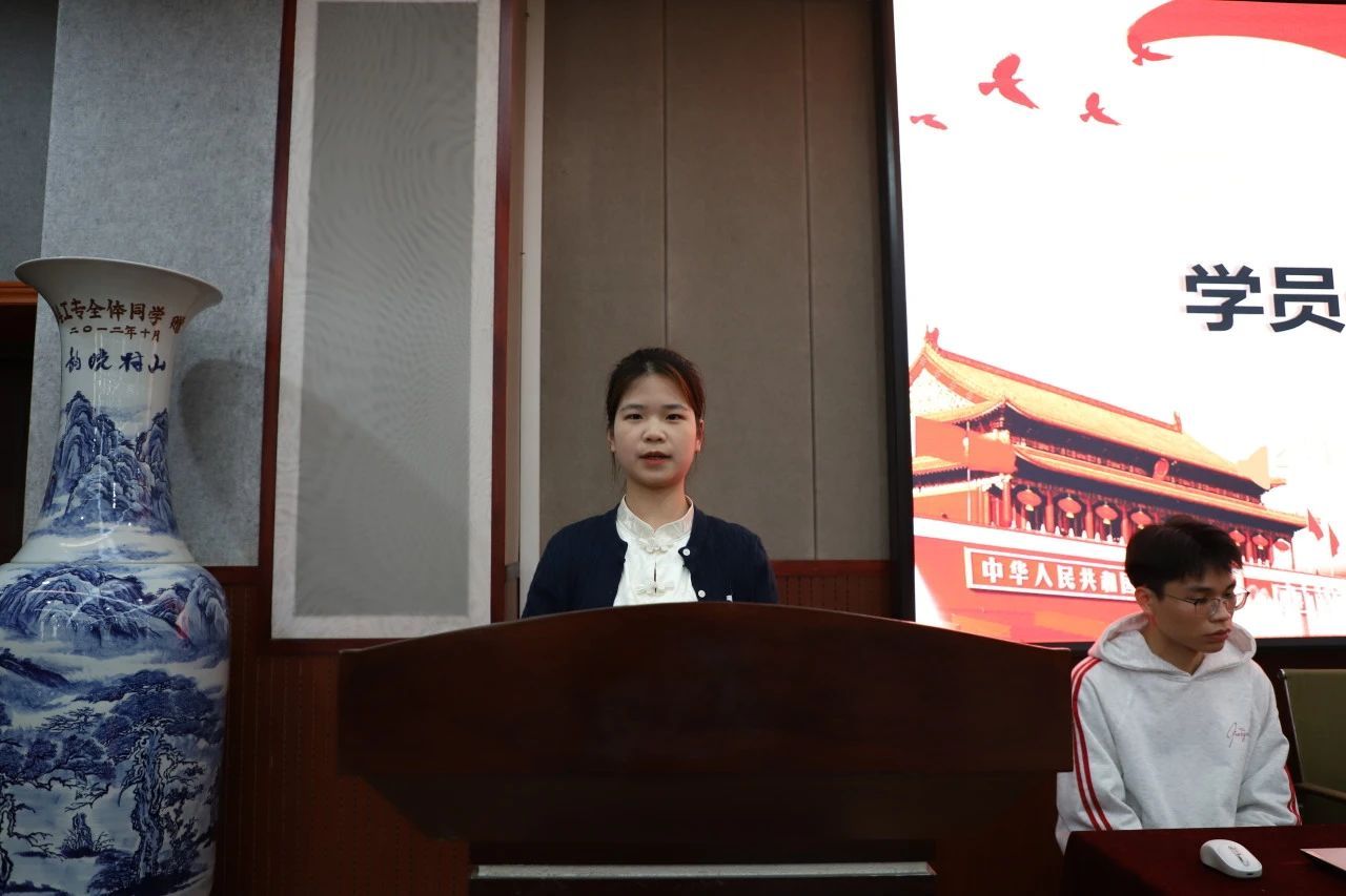 学员代表李美芳发言,她代表本期学员面向学院党组织庄重表态,将以积极的态度投入培训,将党的理论学习内化于心、外化于行,在日常学习、生活中发挥先锋模范作用,以思考深化理解,以理解指导实践,从小事做起、从现在做起,不断提升自身综合素质,自觉接受党组织考验,不仅要做到组织上入党,更要做到思想上入党。
