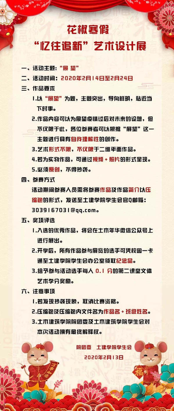 活动期间参赛人员需将参赛作品及作品简介以压缩包的形式,发送至土建学院学生会官Q邮箱:3039167031@qq.com.