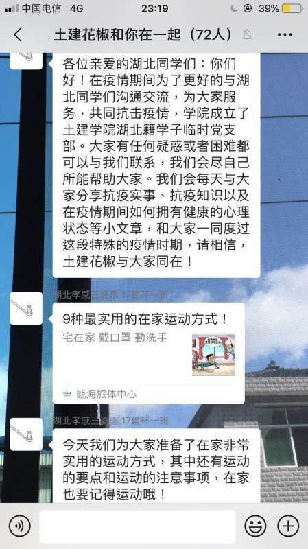 为响应国家体育总局《关于大力推广居家科学健身方法的通知》,积极倡导居家科学健身方式,助力打赢疫情防控阻击战。3044永利集团通过湖北籍学生临时党支部,引导湖北籍学生在家锻炼,坚持打卡。
