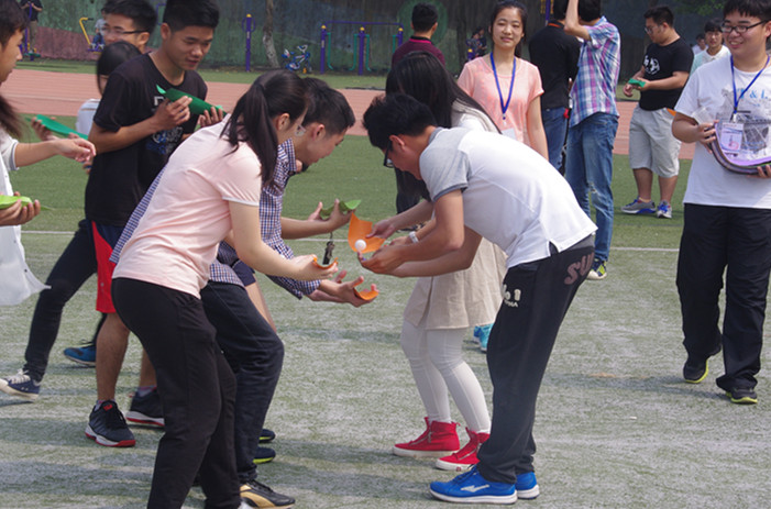 “一二,一二……”同学们在这里进行紧张的拔河比赛,15环境工程专业学生凭借着自身绝对的实力与拔河技巧的正确使用,一路势如破竹,最终托起大力神杯,取得第一名的好成绩。一手托脚,一手搭肩,互相配合蹦跳前行,南水北调游戏考验队员们的协调配合能力,体现了他们之间的信任,增进他们之间的感情。
