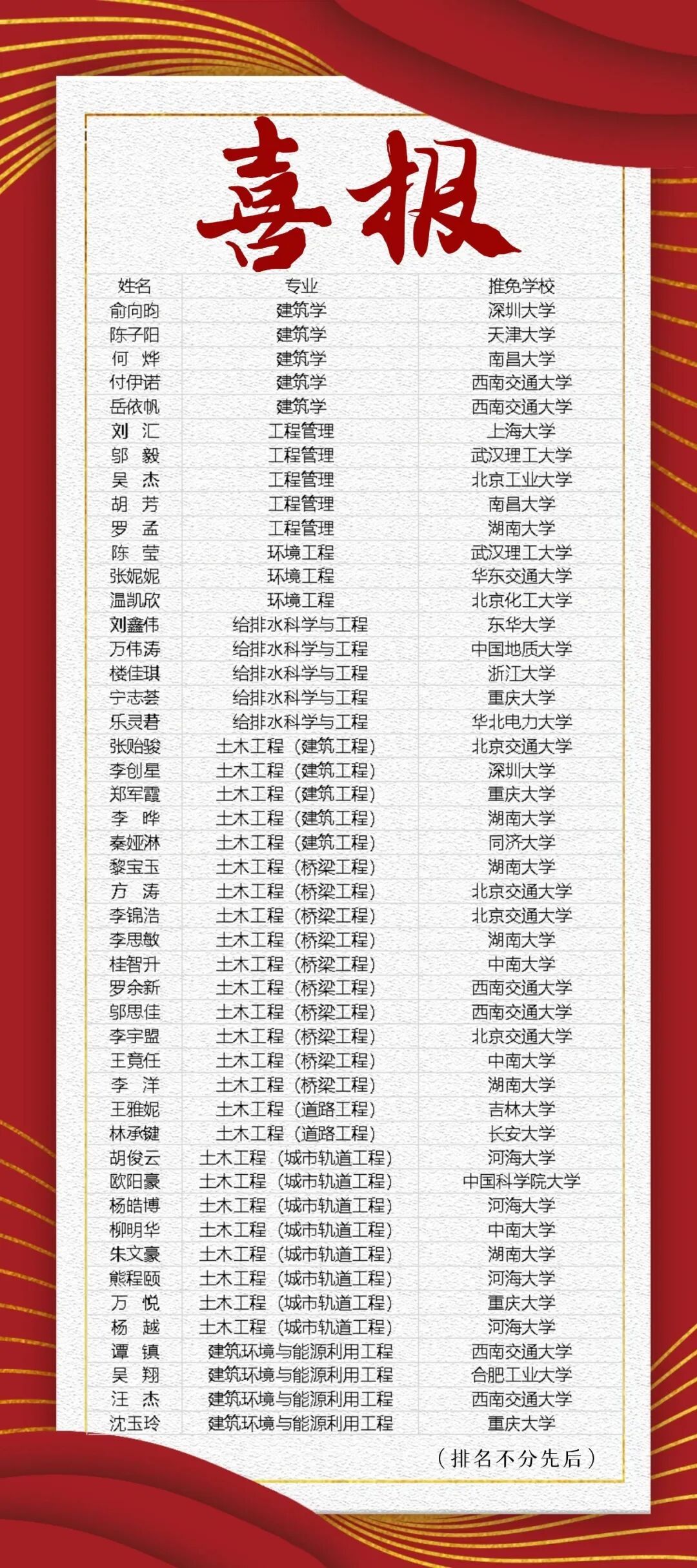 本届推免生中,共有17人被985高校录取,25人被211高校录取,其中不乏浙江大学、中国科学院大学、同济大学、天津大学、中南大学等多所国内高水平大学。同学们凭借扎实的专业功底、出色的综合素质与不懈的拼搏精神,赢得了众多知名高校的认可,充分展现了我院学子优秀的成长潜力和学院人才培养的显著成效。