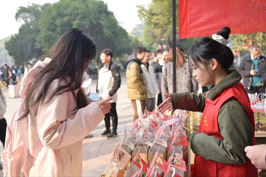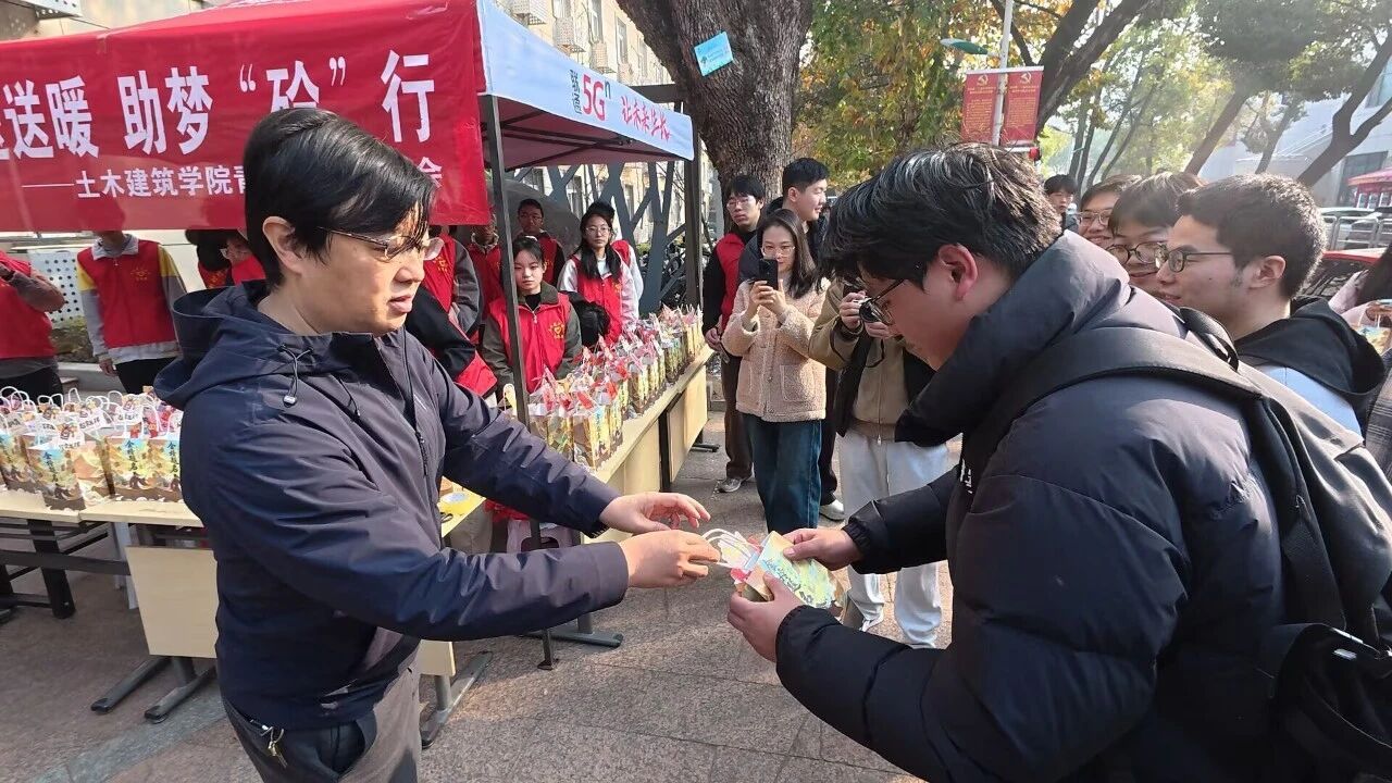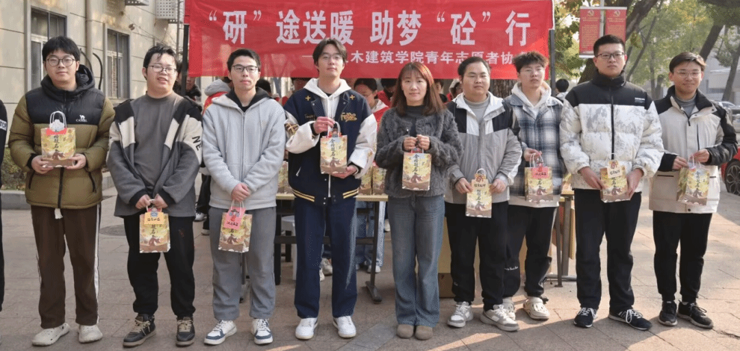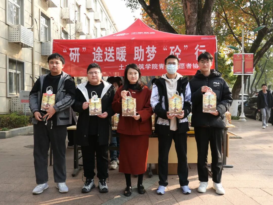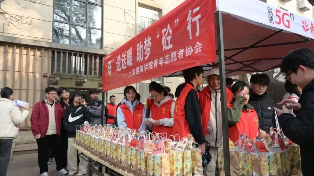 土建青协的志愿者们为考生们分发福袋