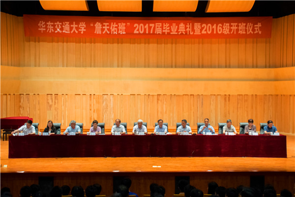 为弘扬天佑精神,树立新时代天佑人的榜样,5月25日,我校于艺术学院音乐厅举行2017届詹天佑班毕业典礼暨2016级詹天佑班命名典礼。詹天佑科学技术基金会理事长蔡庆华出席典礼并为现场师生作《中国的高速铁路》专题讲座,詹天佑科学基金会副理事长兼秘书长宋凤书,副秘书长赵炎、周建昌,校党委书记万明,校长罗玉峰出席。党委副书记汪立夏主持典礼。土建、交运学院领导、“詹天佑班”辅导员和全体学生共计500余人参加活动。