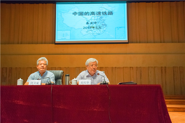 典礼结束后,蔡庆华向我校詹天佑班学生作《中国的高速铁路》专讲座。蔡庆华理事长结合自身经历,从高速铁路的定义、中国高速铁路建设之争、京沪高速铁路的建设和运营、中国高速铁路的建设和规划四个方面进行授课。最后,他勉励大家:一是要有远大正确的方向和目标,二是要不断积累善于思维的勤奋精神,三是要有脚踏实地艰苦创业的扎实精神。