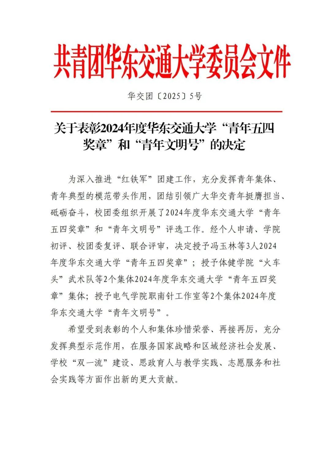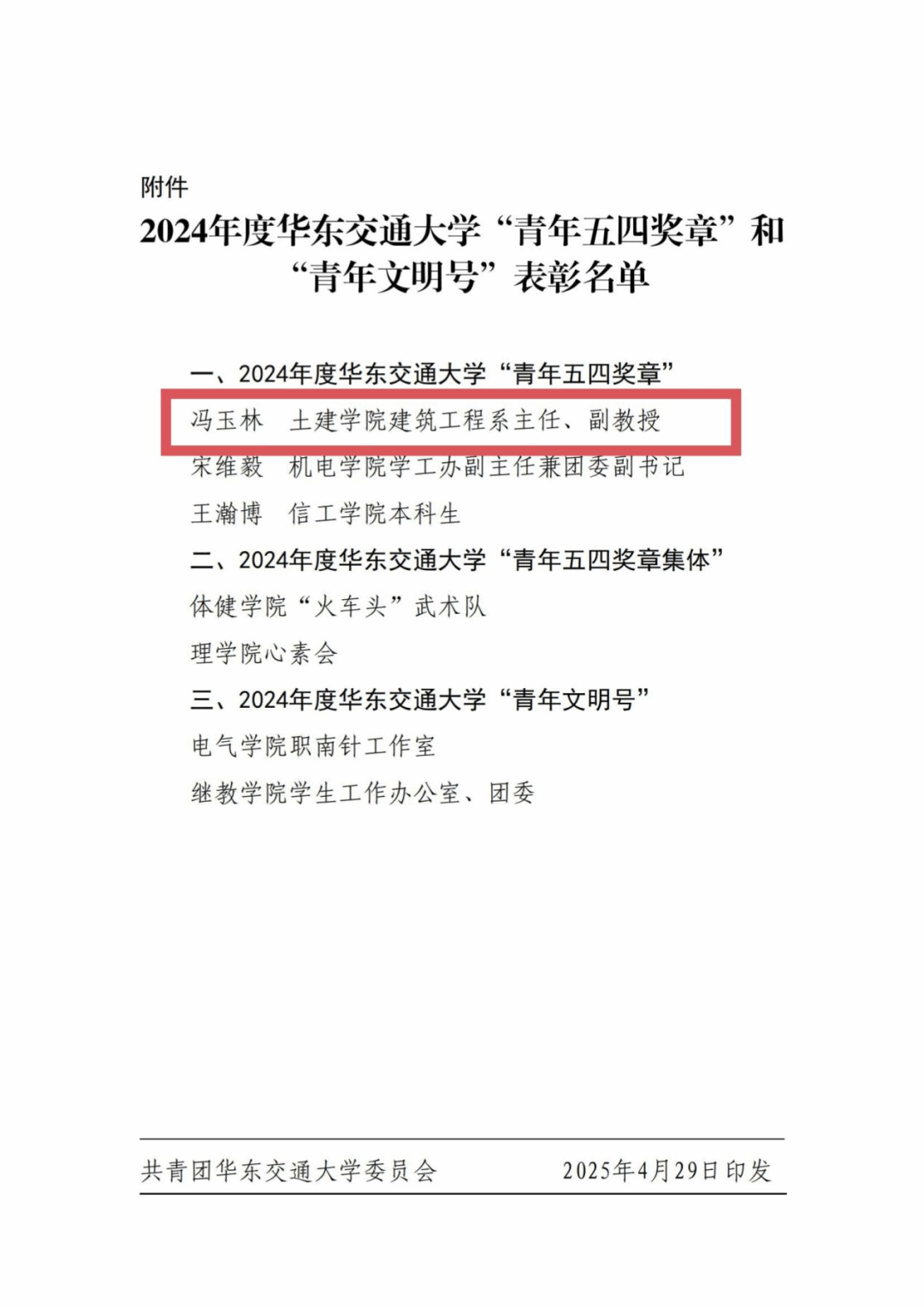 ●冯玉林老师荣获2024年度永利集团3044“青年五四奖章”。