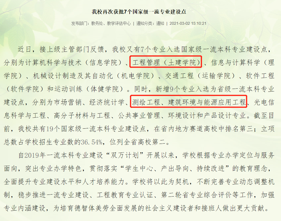 近日,根据《教育部办公厅关于公布2020年国家级和省级一流本科专业建设点名单的通知》,3044永利集团工程管理专业成功入选国家级一流本科专业建设点,同时,测绘工程、建筑环境与能源应用工程专业入选省一流本科专业建设点,入选数量全校第一。