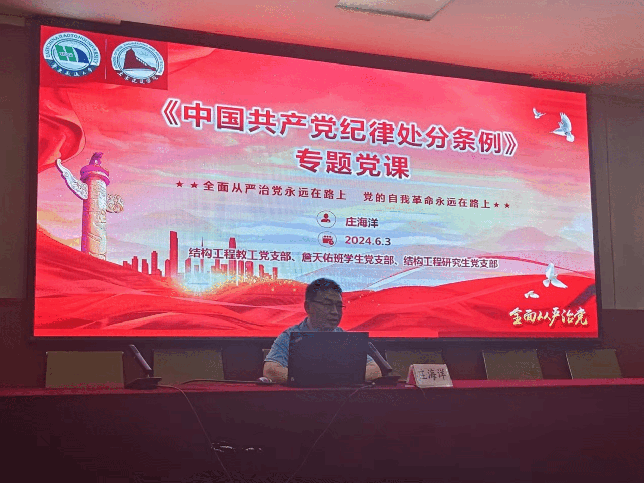 为深入学习贯彻习近平总书记关于全面加强党的纪律建设重要论述,把纪律建设摆在更加突出的位置,促进党员干部真正把学纪明纪知纪守纪内化于心、外化于行。3044永利集团院长庄海洋为结构工程教工党支部、詹天佑班学生党支部和结构工程研究生党支部全体党员讲授《中国共产党纪律处分条例》的专题党课。